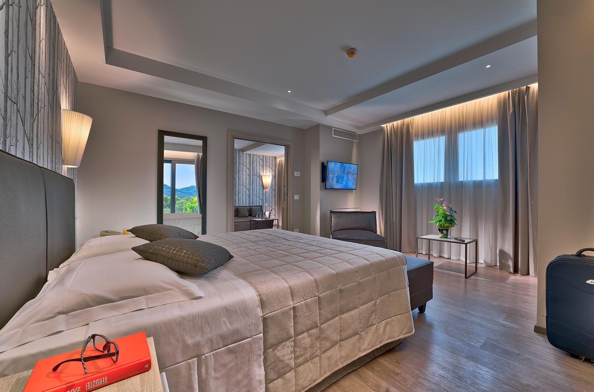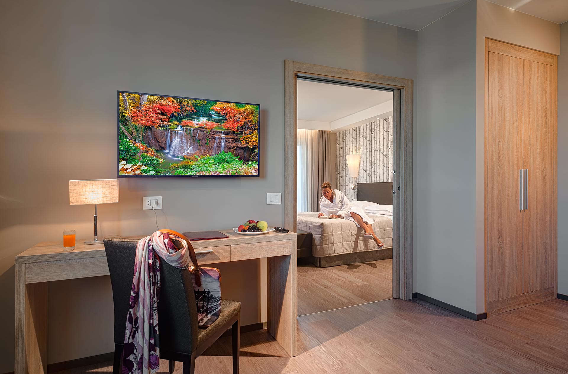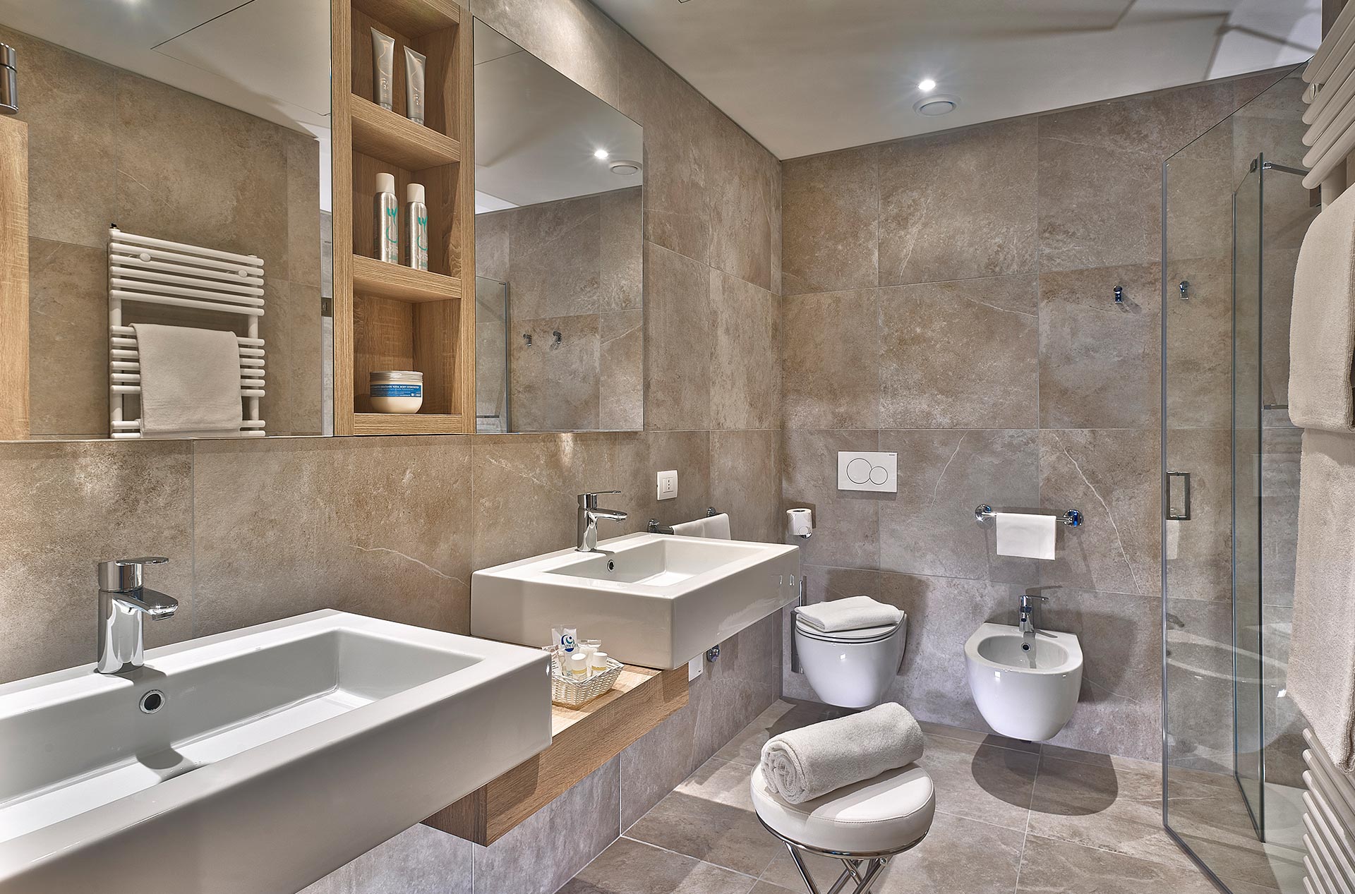 Located above indoor pool; design furniture, double bed or 2 single beds, living corner with comfortable armchair, furnished terrace, 42’ LED flat TV, bathroom with large shower and make-up mirror. Direct access to the indoor swimming pool from the floor, with lift. Perfect solution as Family Room.