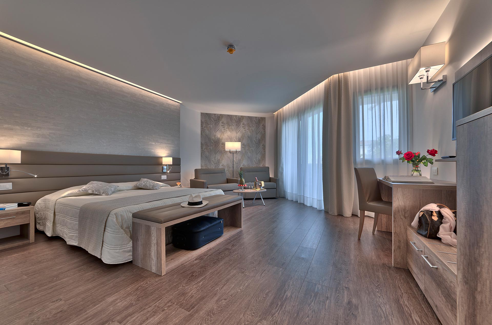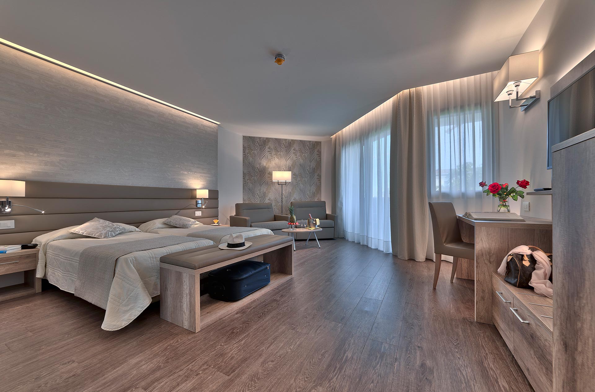 Furnished with design furniture, with laminate floor, double bed or 2 single beds, living corner with comfortable armchair, furnished terrace, 42' LED flat TV, safe