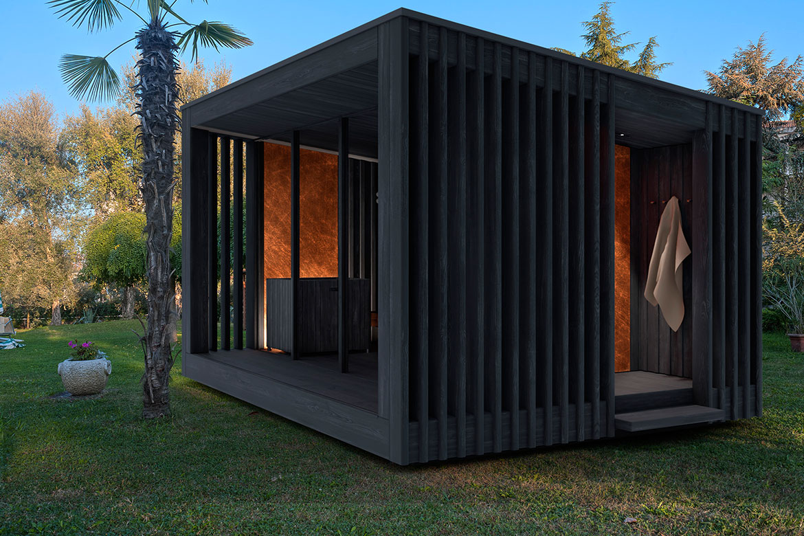 Nature Sauna è la sauna outdoor di Starpool pensata per entrare in sinergia con l’ambiente, evolvendo con esso al passare del tempo e restituendo a chi la “abita” un senso di appartenenza e immersione nel paesaggio. L’edificio, l’uomo e la natura si fanno tutt’uno attraverso i materiali della costruzione, selezionati per reagire in maniera unica rispetto al contesto: il rame spazzolato a protezione del legno ossiderà in maniera differente a seconda del clima e il rivestimento ligneo, esposto agli elementi atmosferici, assumerà connotazioni irripetibili.